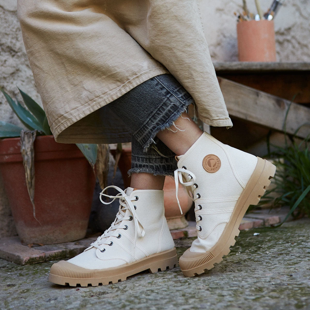 Découvrez la nouvelle version de la boots femme Authentique. Cette saison, la boots traditionnelle et iconique de Pataugas est munie d’une toile légère et résistante en coton bio et est montée sur une semelle design en caoutchouc naturel. En plus de sa couleur épurée, cette chaussure en toile est ultra-souple grâce aux nouvelles matières utilisées. C’est une boots parfaite pour la baroudeuse moderne en quête de confort et de style.
