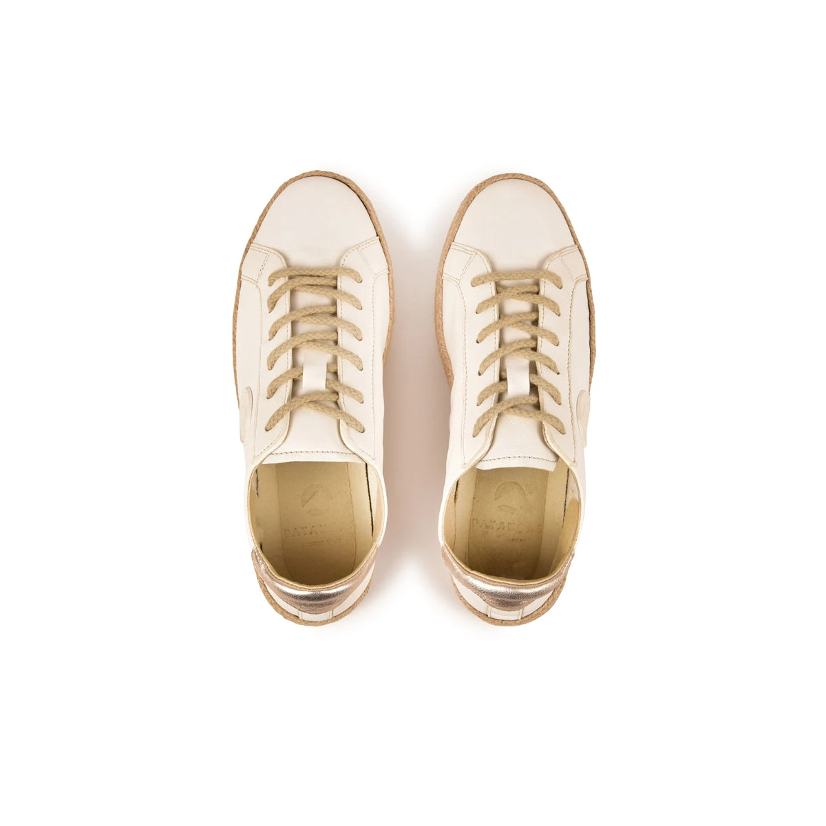 Découvrez le nouvel indispensable de votre garde-robe, l’espadrille femme PAM. Cette chaussure femme est le mix parfait entre une sneaker et une espadrille. Sa tige est conçue d’un cuir blanc éclatant et très souple, qui est monté sur une semelle en corde tressée. On craque pour le détail des lacets en corde qui fait un rappel à la semelle. Cette espadrille est entièrement doublée cuir afin de la porter nu-pieds.
